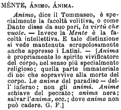 | Mente, Animo, Anima - Animo, dice il Tommaseo, è specialmente la facoltà volitiva, o come Dante disse da suo pari, la virtù che vuole. - Invece la Mente è la facoltà intelletiva. E tale distinzione si vede mantenuta scrupolosamente anche appresso i Latini. - [Anima è propriamente lo spirito vivificatore del corpo; nel senso più specialmente religioso; quella parte immateriale di noi che sopravvive alla morte del corpo. Le anime del paradiso - dell'inferno; non gli animi. Anime schiave del peccato; anima nera; salvar l'anima, ecc.; dove animo non può cadere. G. F.] [immagine] |
