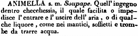 | Animella - s. m. Soupape. Quell'ingegno dentro checchessia, il quale facilita o impedisce l'entrare e l'uscire dell'aria, o di qualche liquore, come nei mantici, soffietti e trombe da trarre acqua. [immagine] |