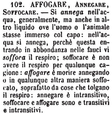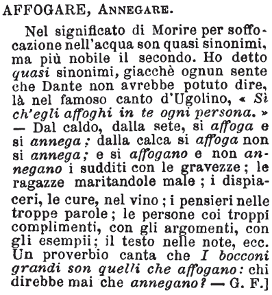 | Affogare, Annegare - Nel significato di Morire per soffocazione nell'acqua son quasi sinonimi, ma più nobile il secondo. Ho detto quasi sinonimi, giacchè ognun sente che Dante non avrebbe potuto dire, là nel famoso canto d'Ugolino, «Sì ch'egli affoghi in te ogni persona.» - Dal caldo, dalla sete, si affoga e si annega; dalla calca si affoga non si annega; e si affogano e non annegano i sudditi con le gravezze; le ragazze maritandole male; i dispiaceri, le cure, nel vino; i pensieri nelle troppe parole; le persone coi troppi complimenti, con gli argomenti, con gli esempii; il testo nelle note, ecc. Un proverbio canta che I bocconi grandi son quelli che affogano: chi direbbe mai che annegano? - G. F.] [immagine] |