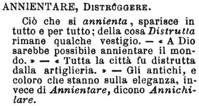 | Annientare, Distruggere - Ciò che si annienta, sparisce in tutto e per tutto; della cosa Distrutta rimane qualche vestigio. - « A Dio sarebbe possibile annientare il mondo.» - «Tutta la città fu distrutta dalla artiglieria.» - Gli antichi, e coloro che stanno sulla eleganza, invece di Annientare, dicono Annichilare. [immagine] |