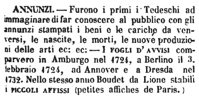 | Annunzi - Furono i primi i Tedeschi ad immaginare di far conoscere al pubblico con gli annunzi stampati i beni e le cariche da venversi, le nascite, le morti, le nuove produzioni delle arti ec: ec: - I fogli d'avvisi comparvero in Amburgo nel 1724, a Berlino il 3. febbraio 1724, ad Annover e a Dresda nel 1732. Nello stesso anno Boudet da Lione stabilì i piccoli affissi (petites affiches de Paris.) [immagine] |