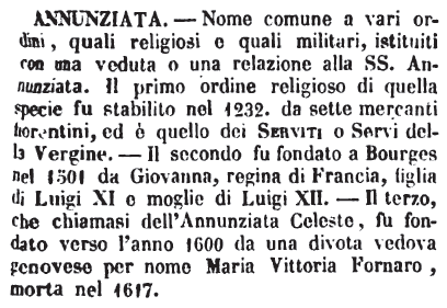 | Annunziata - Nome comune a vari ordini, quali religiosi e quali militari, istituiti con una veduta o una relazione alla SS. Annunziata. Il primo ordine religioso di quella specie fu stabilito nel 1232. da sette mercanti fiorentini, ed è quello dei Serviti o Servi della Vergine. - Il secondo fu fondato a Bourges nel 1501 da Giovanna, regina di Francia, figlia di Luigi XI e moglie di Luigi XII. - Il terzo, che chiamasi dell'Annunziata Celeste, fu fondato verso l'anno 1600 da una divota vedova genovese per nome Maria Vittoria Fornaro, morta nel 1617. [immagine] |