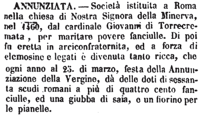 | Annunziata - Società istituita a Roma nella chiesa di Nostra Signora della Minerva, nel 1460, dal cardinale Giovanni di Torrecremata, per maritare povere fanciulle. Di poi fu eretta in arciconfraternita, ed a forza di elemosine e legati è diventata tanto ricca, che ogni anno al 25. di marzo, festa della Annunziazione della Vergine, dà delle doti di sessanta scudi romani a più di quattro cento fanciulle, ed una giubba di saia, e un fiorino per le pianelle. [immagine] |