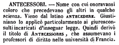 | Antecessori - Nome con cui onoravansi coloro che precedevano gli altri in qualche scienza. Viene dal latino antecedere. Giustiniano lo applicò particolarmente ai giuresconsulti incaricati d'insegnar legge. Quindi derivò il titolo di Antecessores, che assumevano i professori di diritto nelle università di Francia. [immagine] |