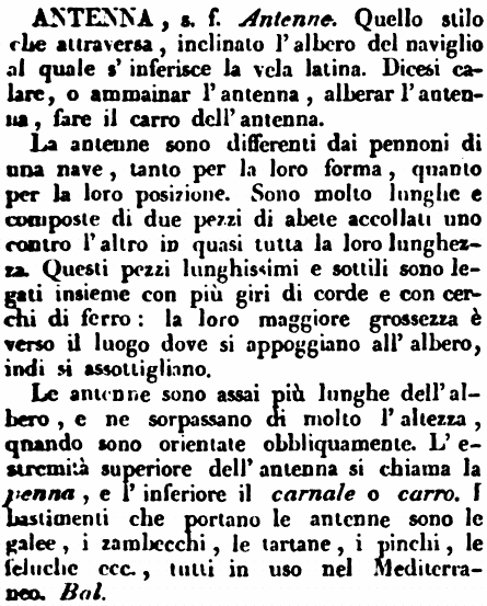 Le antenne sono differenti dai pennoni di una nave, tanto per la loro forma, quanto per la loro posizione. Sono molto lunghe e composte di due pezzi di abete accollati uno contro l'altro in quasi tutta la loro lunghezza. Questi pezzi lunghissimi e sottili sono legati insieme con più giri di corde e con cerchi di ferro: la loro maggiore grossezza è verso il luogo dove si appoggiano all'albero, indi si assottigliano. Le antenne sono assai più lunghe dell'albero, e ne sorpassano di molto l'altezza, quando sono orientate obliquamente. L'estremità superiore dell'antenna si chiama la penna, e l'inferiore il carnale o carro. I bastimenti che portano le antenne sono le galee, i zambecchi, le tartane, i pinchi, le feluche ecc., tutti in uso nel Mediterraneo. Bal. [immagine] |