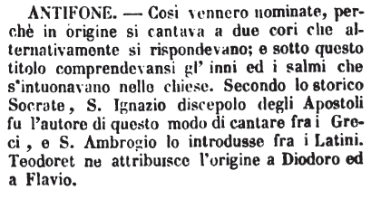 | Antifone - Così vennero nominate, perchè in origine si cantava a due cori che alternativamente si rispondevano; e sotto questo titolo comprendevansi gl'inni ed i salmi che s'intuonavano nelle chiese. Secondo lo storico Socrate, S. Ignazio discepolo degli Apostoli fu l'autore di questo modo di cantare fra i Greci, e S. Ambrogio lo introdusse fra i Latini. Teodoret ne attribuisce l'origine a Diodoro ed a Flavio. [immagine] |