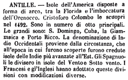 | Antille - Isole dell'America disposte a forma di arco, tra la Florida e l'imboccatura dell'Orenocco. Cristoforo Colombo le scuoprì nel 1492. Sono in numero di otto principali. Le grandi sono: S. Domingo, Cuba, la Giammaica e Porto Ricco. La denominazione di Indie Occidentali proviene dalla circostanza, che all'epoca in cui furono scoperte furono credute isole delle Indie più avanzate all'Est. Gli Spagnuoli le divisero in isole del Vento e Sotto vento. I Francesi e gl'Inglesi hanno adottato queste divisioni con modificazioni diverse. [immagine] |
