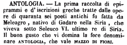 | Antologia - La prima raccolta di epigrammi e d'iscrizioni greche tratte dalle opere di quaranta sei poeti antichi fu fatta da Meleagro, nativo di Gadare nella Siria, che viveva sotto Seleuco VI. ultimo re di Siria. Il buon gusto che vi domina la fece denominare antologia, che vale mazzo di fiori. [immagine] |