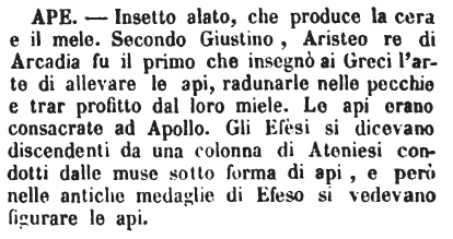 | Ape - Insetto alato, che produce la cera e il mele. Secondo Giustino, Aristeo re di Arcadia fu il primo che insegnò ai Greci l'arte di allevare le api, radunarle nelle pecchie e trar profitto dal loro miele. Le api erano consacrate ad Apollo. Gli Efèsi si dicevano discendenti da una colonna di Ateniesi condotti dalle muse sotto forma di api, e però nelle antiche medaglie di Efeso si vedevano figurare le api. [immagine] |