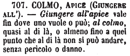 | Colmo, Apice (Giungere all') - Giungere all'apice vale fin dove uno vuole o può; al colmo, quasi al di là, o almeno fino a quel punto che al di là non si può andare, senza pericolo o danno. [immagine] |