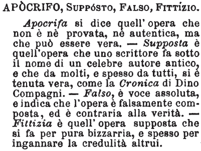| Apocrifo, Supposto, Falso, Fittizio - Apocrifa si dice quell'opera che non è nè provata, nè autentica, ma che può essere vera. - Supposta è quell'opera che uno scrittore fa sotto il nome di un celebre autore antico, e che da molti, e spesso da tutti, si è tenuta vera, come la Cronica di Dino Compagni. - Falso, è la voce assoluta, e indica che l'opera è falsamente composta, ed è contraria alla verità. - Fittizia è quell'opera supposta che si fa per pura bizzarria, e spesso per ingannare la credulità altrui. [immagine] |