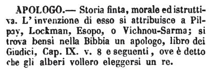 | Apologo - Storia finta, morale ed istruttiva. L'invenzione di esso si attribuisce a Pilpay, Lockman, Esopo, o Vichnou-Sarma; si trova bensì nella Bibbia un apologo, libro dei Giudici, Cap. IX. v. 8 e seguenti, ove è detto che gli alberi vollero eleggersi un re. [immagine] |