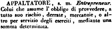 | Appaltatore - s. m. Entrepreneur. Colui che assume l'obbligo di provvedere, a tutto suo rischio, derrate, mercanzie, o altro per servizio degli eserciti, mediante una somma determinata. [immagine] |