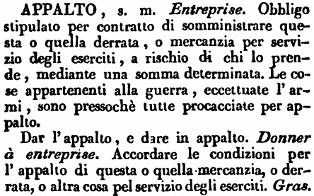 | Appalto - s. m. Entreprise. Obbligo stipulato per contratto di somministrare questa o quella derrata, o mercanzia per servizio degli eserciti, a rischio di chi lo prende, mediante una somma determinata. Le cose appartenenti alla guerra, eccettuate l'armi, sono pressochè tutte procacciate per appalto.