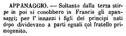 | Appanaggio - Soltanto dalla terza stirpe in poi si conobbero in Francia gli apannaggi; per l'innanzi i figli dei principi nati dopo dividevano a parti eguali col fratello primogenito. [immagine] |