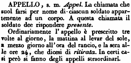 | Appello - s. m. Appel. La chiamata che suol farsi per nome di ciascun soldato appartenente ad un corpo. A questa chiamata il soldato dee rispondere presente.