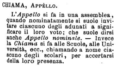 | Chiama, Appello - L'Appello si fa in una assemblea, quando nominatamente si suole invitare ciascuno degli adunati a significare il loro voto; che suole dirsi anche Appello nominale. - Invece la Chiama si fa alle Scuole, alle Università, ecc., chiamando a nome ciascuno degli scolari, per accertarsi della loro presenza. [immagine] |