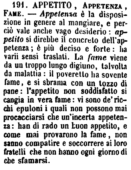 | Appetito, Appetenza, Fame - Appetenza è la disposizione in genere al mangiare, e perciò vale anche vago desiderio: appetito si direbbe il concreto dell'appetenza; è più deciso e forte: ha varii sensi traslati. La fame viene da un troppo lungo digiuno, talvolta da malattia: il poveretto ha sovente fame, e si sbrama con un tozzo di pane: l'appetito non soddisfatto si cangia in vera fame: vi sono de' ricchi epuloni i quali non possono mai procacciarsi che un'incerta appetenza: han di rado un buon appetito, e come mai provarono la fame, non sanno compatire e soccorrere ai loro fratelli che non hanno ogni giorno di che sfamarsi. [immagine] |