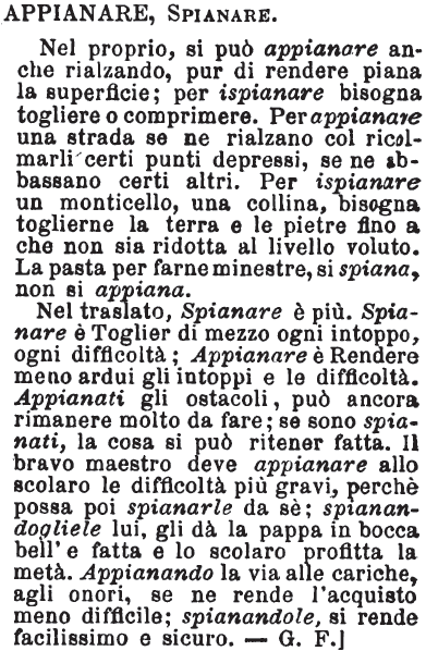 Nel traslato, Spianare è più. Spianare è Toglier di mezzo ogni intoppo, ogni difficoltà; Appianare è Rendere meno ardui gli intoppi e le difficoltà. Appianati gli ostacoli, può ancora rimanere molto da fare; se sono spianati, la cosa si può ritener fatta. Il bravo maestro deve appianare allo scolaro le difficoltà più gravi, perchè possa poi spianarle da sè; spianandogliele lui, gli dà la papa in bocca bell'e fatta e lo scolaro profitta la metà. Appianando la via alle cariche, agli onori, se ne rende l'acquisto meno difficile; spianandole, si rende facilissimo e sicuro. - G. F.] [immagine] |