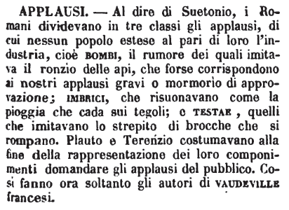 | Applausi - Al dire di Suetonio, i Romani dividevano in tre classi gli applausi, di cui nessun popolo estese al pari di loro l'industria, cioè bombi, il rumore dei quali imitava il ronzio delle api, che forse corrispondono ai nostri applausi gravi o mormorìo di approvazione; imbrici, che risuonavano come la pioggia che cada sui tegoli; e testae, quelli che imitavano lo strepito di brocche che si rompano. Pluto e Terenzio costumavano alla fine della rappresentazione dei loro componimenti domandare gli applausi del pubblico. Così fanno ora soltanto gli autori di vaudeville francesi. [immagine] |