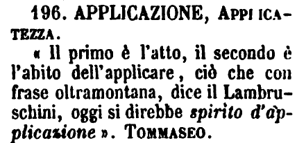 | Applicazione, Applicatezza - «Il primo è l'atto, il secondo è l'abito dell'applicare, ciò che con frase oltramontana, dice il Lambruschini, oggi si direbbe spirito d'applicazione». Tommaseo. [immagine] |