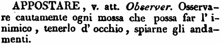 | Appostare - v. att. Observer. Osservare cautamente ogni mossa che possa far l'inimico, tenerlo d'occhio, spiarne gli andamenti. [immagine] |