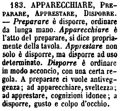 | Apparecchiare, Preparare, Apprestare, Disporre - Preparare è disporre, ordinare da lunga mano. Apparecchiare è l'atto del preparare, si dice propriamente della tavola. Apprestare non solo è disporre, ma disporre ad uso determinato. Disporre è ordinare in modo acconcio, con una certa regola. A preparare ci vuole antiveggenza; ad apparecchiare, sveltezza; ad apprestare, cognizioni idonee; a disporre, gusto e colpo d'occhio. [immagine] |