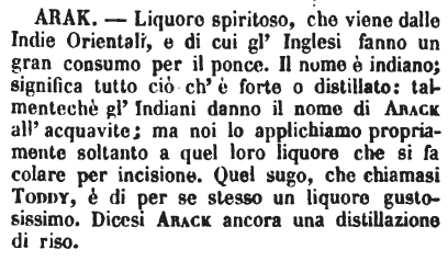 | Arak - Liquore spiritoso, che viene dalle Indie Orientali, e di cui gl'Inglesi fanno un gran consumo per il ponce. Il nome è indiano; significa tutto ciò ch'è forte o distillato: talmentechè gl'Indiani danno il nome di Arack all'acquavite; ma noi lo applichiamo propriamente soltanto a quel loro liquore che si fa colare per incisione. Quel sugo, che chiamasi Toddy, è di per se stesso un liquore gustosissimo. Dicesi Arack ancora una distillazione di riso. [immagine] |