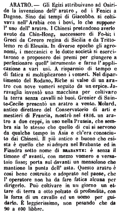 | Aratro - Gli Egizi attribuivano ad Osiride la invenzione dell'aratro, ed i Fenici a Dagone. Sino dai tempi di Giacobbe si coltivava nell'Arabia con i bovi, lo che suppone l'uso dell'aratro. I Chinesi pretendono averlo avuto da Chin-Hong, successore di Fo-hi; i Greci da Cerere regina di Sicilia e da Trittolemo re di Eleusia. In diverse epoche gli agronomi, i meccanici e le dotte società si esercitarono e proposero dei premi per giungere a perfezionare quell'istrumento e farne l'applicazione a vari usi. A risparmio di tempo e di fatica si moltiplicarono i vomeri. Nel dipartimento del Rodano, Riche si valse di un aratro con nove vomeri seguito da un erpice. Jaravaglia inventò una macchina per coltivare la terra senza cavalli nè buoi. Grenier di Sainte-Cecile presentò un aratro a vento. Molard, antico direttore del Conservatorio di arti e mestieri di Francia, mostrò nel 1816. un aratro a due ceppi, in uso nella Prussia, che sembra sia lo stesso che quello di cui si servono da qualche tempo in Asia e ch'era conosciuto dai Chinesi. Il più antico e buono che esista è quello che si adopra nel Brabante ed in Fiandra sotto nome di brabante: è senza il timone d'avanti, con mezzo vomero e versatoio fisso; porta sul davanti un mensolone che mantiene la punta dell'asta. Questo aratro è così bene costruito e adoprato nel paese, che l'operatore non ha da fare fatica alcuna per dirigerlo. Può coltivare in un giorno un ettare di terra a otto polzate di profondità, con la forza di un cavallo ed un uomo per guidarlo. E' leggierissimo, non pesando che da 90 a 100 libbre. [immagine] |