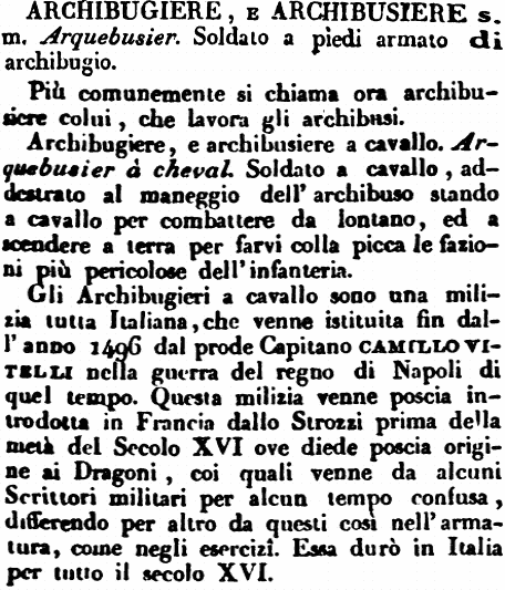 Più comunemente si chiama ora archibusiere colui, che lavora agli archibusi. Archibugiere, e archibusiere a cavallo. Arquebusier à cheval. Soldato a cavallo, addestrato al maneggio dell'archibuso stando a cavallo per combattere da lontano, ed a scendere a terra per farvi colla picca le fazioni più pericolose dell'infanteria. Gli Archibugieri a cavallo sono una milizia tutta Italiana, che venne istituita fin dall'anno 1496 dal prode Capitano camillo vitelli nella guerra del regno di Napoli di quel tempo. Questa milizia venne poscia introdotta in Francia dallo Strozzi prima della metà del Secolo XVI ove diede poscia origine ai Dragoni, coi quali venne da alcuni Scrittori militari per alcun tempo confusa, differendo per altro da questi così nell'armatura, come negli esercizi. Essa durò in Italia per tutto il secolo XVI. [immagine] |
