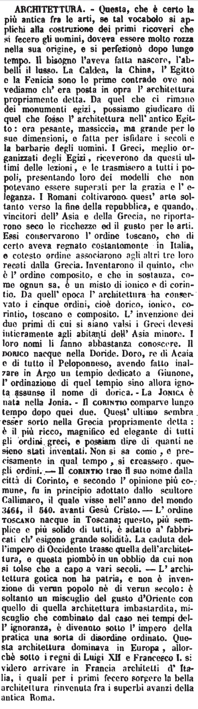 | Architettura - Questa, che è certo la più antica fra le arti, se tal vocabolo si applichi alla costruzione dei primi ricoveri che si fecero gli uomini, doveva essere molto rozza nella sua origine, e si perfezionò dopo lungo tempo. Il bisogno l'aveva fatta nascere, l'abbellì il lusso. La Caldea, la China, l'Egitto e la Fenicia sono le prime contrade ove noi vediamo ch'era posta in opra l'architettura propriamente detta. Da quel che ci rimane dei monumenti egizi, possiamo giudicare di quel che fosse l'architettura nell'antico Egitto: era pesante, massiccia, ma grande per le sue dimensioni, e fatta per isfidare i secoli e la barbarie degli uomini. I Greci, meglio organizzati degli Egizi, riceverono da questi ultimi delle lezioni, e le trasmisero a tutti i popoli, presentando loro dei modelli che non potevano essere superati per la grazia e l'eleganza. I Romani coltivarono quest'arte soltanto verso la fine della repubblica, e quando, vincitori dell'Asia e della Grecia, ne riportarono seco le ricchezze ed il gusto per le arti. Essi conservarono l'ordine toscano, che di certo aveva regnato costantemente in Italia, e cotesto ordine associarono agli altri tre loro recati dalla Grecia. Inventarono il quinto, che è l'ordine composito, e che in sostanza, come ognun sa, è un misto di ionico e di corintio. Da quell'epoca l'architettura ha conservato i cinque ordini, cioè dorico, ionico, corintio, toscano e composito. L'invenzione dei due primi di cui si siano valsi i Greci devesi intieramente agli abitanti dell'Asia minore. I loro nomi li fanno abbastanza conoscere. Il dorico nacque nella Doride. Doro, re di Acaia e di tutto il Peloponneso, avendo fatto inalzare in Argo un tempio dedicato a Giunone, l'ordinazione di quel tempio sino allora ignota assunse il nome di dorica. - La Jonica è nata nella Jonia. Il corintio comparve lungo tempo dopo quei due. Quest'ultimo sembra esser sorto nella Grecia propriamente detta: è il più ricco, magnifico ed elegante di tutti gli ordini greci, e possiam dire di quanti ne sieno stati inventati. Non si sa come, e precisamente in qual tempo, si creassero quegli ordini. - Il corintio trae il suo nome dalla città di Corinto, e secondo l'opinione più comune, fu in principio adottato dallo scultore Callimaco, il quale visse nell'anno del mondo 3464, il 540. avanti Gesù Cristo. - L'ordine toscano nacque in Toscana; questo, più semplice e più solido di tutti, è adatto a' fabbricati ch'esigono grande solidità. La caduta dell'impero di Occidente trasse quella dell'architettura, e questa piombò in un obblio da cui non si tolse che a capo a vari secoli. - L'architettura gotica non ha patria, e non è invenzione di verun popolo nè di verun secolo: è soltanto un miscuglio del gusto d'Oriente con quello di quella architettura imbastardita, miscuglio che combinato dal caso nei tempi dell'ignoranza, è diventato sotto l'impero della pratica una sorta di disordine ordinato. Questa architettura dominava in Europa, allorchè sotto i regni di Luigi XII e Francesco I. si videro arrivare in Francia architetti d'Italia, i quali per i primi fecero sorgere la bella architettura rinvenuta fra i superbi avanzi della antica Roma. [immagine] |