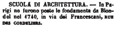 | Scuola di architettura - In Parigi ne furono poste le fondamenta da Blondel nel 1740, in via dei Francescani, Rue des Cordeliers. [immagine] |