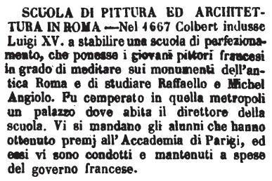 | Scuola di pittura ed architettura in roma - Nel 1667 Colbert indusse Luigi XV. a stabilire una scuola di perfezionamento, che ponesse i giovani pittori francesi in grado di meditare sui monumenti dell'antica Roma e di studiare Raffaello e Michel Angiolo. Fu comperato in quella metropoli un palazzo dove abita il direttore della scuola. Vi si mandano gli alunni che hanno ottenuto premj all'Accademia di Parigi, ed essi vi sono condotti e mantenuti a spese del governo francese. [immagine] |