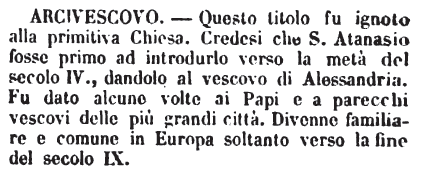 | Arcivescovo - Questo titolo fu ignoto alla primitiva Chiesa. Credesi che S.Atanasio fosse primo ad introdurlo verso la metà del secolo IV., dandolo al vescovo di Alessandria. Fu dato alcune volte ai Papi e a parecchi vescovi delle più grandi città. Divenne familiare e comune in Europa soltanto verso la fine del secolo IX. [immagine] |