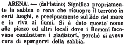 | Arena - (dal latino) Significa propriamente la sabbia o rena che ricuopre il terreno in certi luoghi, e precipuamente sul lido del mare e in riva ai fiumi. Si è dato questo nome alle piazze ed altri locali dove i Romani facevano combattere i gladiatori, perché si aveva cura di spargervi della sabbia. [immagine] |
