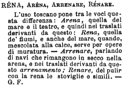 | Rena, Arena, Arrenare, Renare - L'uso toscano pone tra le voci questa differenza: Arena, quella del mare e il teatro, e quindi nei traslati derivanti da questo: Rena, quella de' fiumi, e anche del mare, quando, mescolata alla calce, serve per opere di muratura. - Arrenare, parlando di navi che rimangono in secco nella arena, e nei traslati derivanti da questo arrenamento; Renare, del pulir con la rena le stoviglie e simili. - G. F. [immagine] |