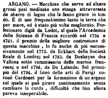 | Argano - Macchina che serve ad alzare grossi pesi mediante una stanga attraversata da sbarre di legno che la fanno girare in tondo. E' di uso frequentissimo tanto in terra che per mare, ed è stato più volte megliorato. Perferzionato digià da Lodot, al quale l'Accademia delle Scienze di Francia accordò nel 1734 e 1741. il premio della migliore costruzione di questa macchina, lo fu anche di più successivamente nel 1773. da Eckhart della Società Reale di Londra; nel 1783. da Deshayes des Vallons sotto commissario della marina francese; e nel 1794. da De Lalande. Sul principio del 1794. da De Lalande. Sul principio del 1794. il liceo delle arti di Parigi coronò Cardonet per la formazione di un argano col quale si può girare continuamente senza cambiare la corda, difficoltà che fino allora pareva insuperabile. [immagine] |