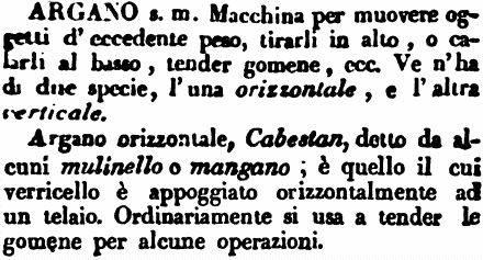 Argano - s. m. Macchina per muovere oggetti d'eccedente peso, tirarli in alto, o calarli al basso, tender gomene, ecc. Ve n'ha di due specie, l'una orizzontale, e l'altra verticale.