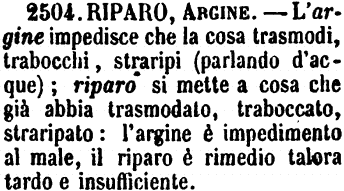 | Riparo, Argine - L'argine impedisce che la cosa trasmodi, trabocchi, straripi (parlando d'acque); riparo si mette a cosa che già abbia trasmodato, traboccato, straripato: l'argine è impedimento al male, il riparo è rimedio talora tardo e insufficiente. [immagine] |