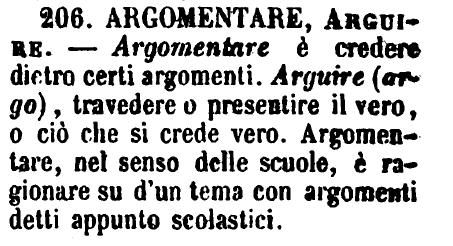 | Argomentare, Arguire - Argomentare è credere dietro certi argomenti. Arguire (argo), travedere o presentire il vero, o ciò che si crede vero. Argomentare, nel senso delle scuole, è ragionare su d'un tema con argomenti detti appunto scolastici. [immagine] |