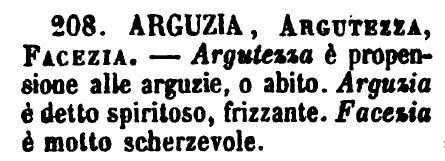 | Arguzia, Argutezza, Facezia - Argutezza è propensione alle arguzie, a abito. Arguzia è detto spiritoso, frizzante. Facezia è motto scherzevole. [immagine] |