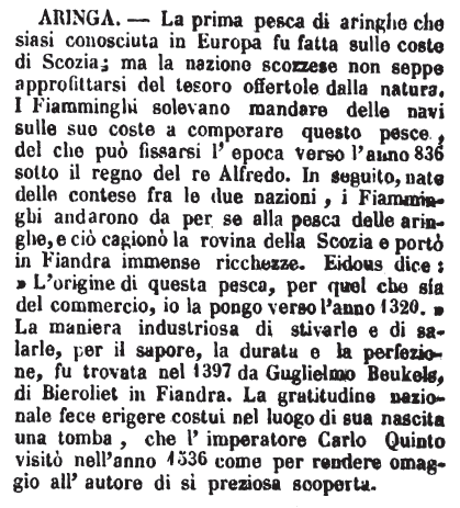 | Aringa - La prima pesca di aringhe che siasi conosciuta in Europa fu fatta sulle coste di Scozia; ma la nazione scozzese non seppe approfittarsi del tesoro offertole dalla natura. I Fiamminghi solevano mandare delle navi sulle sue coste a comperare questo pesce, del che può fissarsi l'epoca verso l'anno 836 sotto il regno del re Alfredo. In seguito, nate delle contese fra le due nazioni, i Fiamminghi andarono da per se alla pesca delle aringhe, e ciò cagionò la rovina della Scozia e portò in Fiandra immense ricchezze. Eidous dice: «L'origine di questa pesca, per quel che sìa del commercio, io la pongo verso l'anno 1320.» La maniera industriosa di stivarle e di salarle, per il sapore, la durata e la perfezione, fu trovata nel 1397 da Gugliemo Beukels, di Bieroliet in Fiandra. La gratitudine nazionale fece erigere costui nel luogo di sua nascita una tomba, che l'imperatore Carlo Quinto visitò nell'anno 1536 come per rendere omaggio all'autore di sì preziosa scoperta. [immagine] |