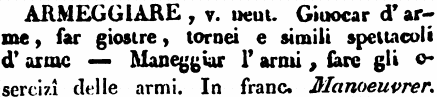 | Armeggiare - v. neut. Giuocar d'arme, far giostre, tornei e simili spettacoli d'arme - Maneggiar l'armi, fare gli esercizi delle armi. In franc. Manoeuvrer. [immagine] |