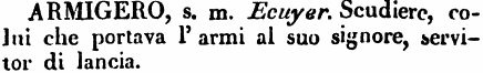 | Armigero - s. m. Ecuyer. Scudiere, colui che portava l'armi al suo signore, servitor di lancia. [immagine] |