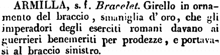 | Armilla - s. f. Bracelet. Girello in ornamento del braccio, smaniglia d'oro, che gli imperadori degli eserciti romani davano ai guerrieri benemeriti per prodezze, e portavasi al braccio sinistro. [immagine] |