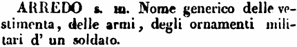 | Arredo - s. m. Nome generico delle vestimenta, delle armi, degli ornamenti militari d'un soldato. [immagine] |