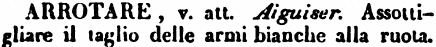 | Arrotare - e ARRUOTARE. V. a. Da RUOTA. Assottigliare il taglio de' ferri alla ruota. Coll. SS. PP. (C) Vedendolo il garzone fuor d'usanza arrotare il coltellaccio. Stor. Eur. 1. 18. Dove solo abbonda il ferro, e di pietra da arrotarlo. Poliz. 2. 45. (Mt.) E farai, come suol marmorea rota, Ch'ella non taglia, e pure il ferro arrota.