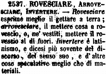| Rovesciare, Arrovesciare, Invertere - Rovesciare esprime meglio il gettare a terra; arrovesciare, il mettere cosa a rovescio, e, ne' vestiti, mettere il rovescio al di fuori. Invertere è latinismo, e dicesi più sovente del discorso, del senso suo, e d'altre cose speculative meglio che di materiali. [immagine] |