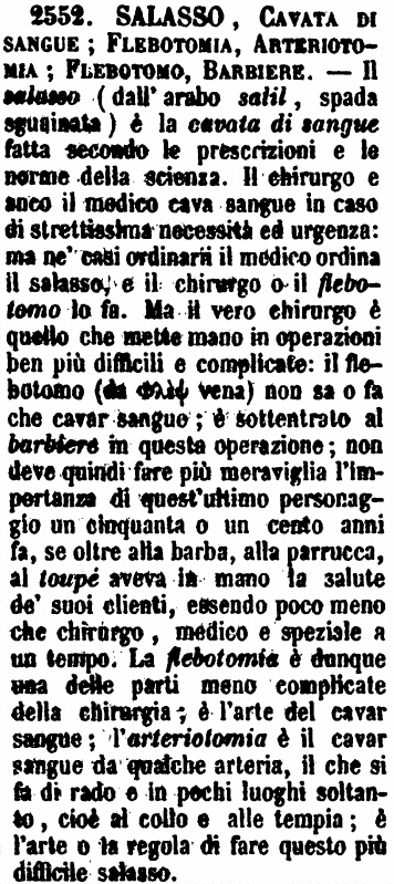 | Salasso, Cavata di sangue; Flebotomia, Arteriotomia; Flebotomo, Barbiere - Il salasso (dall'arabo salil, spada sguainata) è la cavata di sangue fatta secondo le prescrizioni e le norme della scienza. Il chirurgo e anco il medico cava sangue in caso di strettissima necessità ed urgenza: ma ne' casi ordinarii il medico ordina il salasso, e il chirurgo o il flebotomo lo fa. Ma il vero chirurgo è quello che mette mano in operazioni ben più difficili e complicate: il flebotomo (da φλέψ vena) non sa o fa che cavar sangue; è sottentrato al barbiere in questa operazione; non deve quindi fare più meraviglia l'importanza di quest'ultimo personaggio un cinquanta o un cento anni fa, se oltre alla barba, alla parrucca, al toupé aveva in mano la salute de' suoi clienti, essendo poco meno che chirurgo, medico e speziale a un tempo. La flebotomia è dunque una delle parti meno complicate della chirurgia; è l'arte del cavar sangue; l'arteriotomia è il cavar sangue da qualche arteria, il che si fa di rado e in pochi luoghi soltanto, cioè al collo e alle tempia; è l'arte o la regola di fare questo più difficile salasso. [immagine] |
