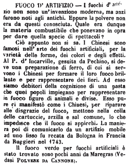 Ciò appunto non si sa. I Chinesi sono famosi nell'arte dei fuochi artificiali, per la varietà delle forme, dei colori e degli effetti. Al P. d'Incarville, gesuita da Pechino, si deve una preparazione di ferro, di cui si servono i Chinesi per formare il loro fuoco brillante e per rappresentare dei fiori. Ad esso siamo debitori della cognizione di una pasta che quei popoli impiegano per rappresentare in fuoco figure di animali e divise. Esso pure ci manifestò come i Chinesi, per riparare alle disgrazie del fuoco, mettono nella colla delle cartuccie, arzilla e sal comune, lo che impedisce che il fuoco si appicchi. La maniera poi di comunicarlo da un artifizio mobile ad uno fisso fu recata da Bologna in Francia da Ruggieri nel 1743. Il fuoco verde per fuochi artificiali è stato trovato sono pochi anni da Maregras (Vedasi Polvere da Cannone) [immagine] |